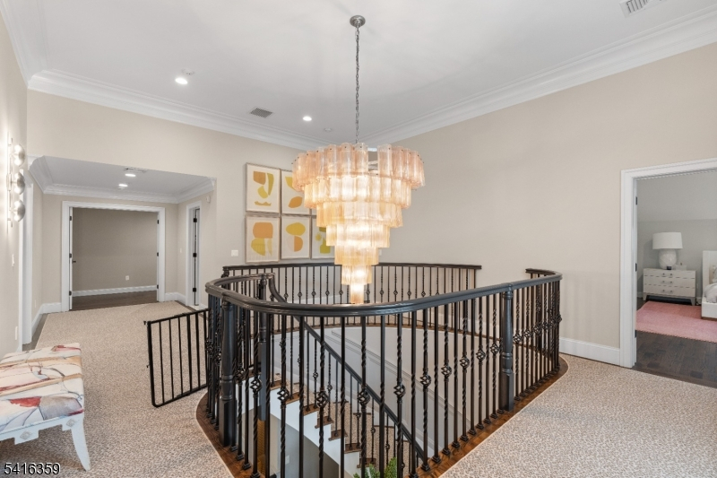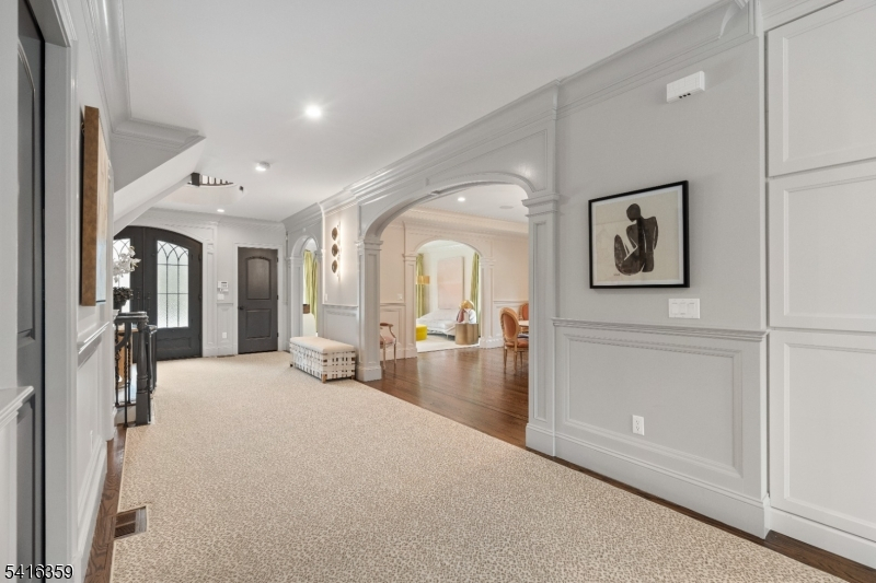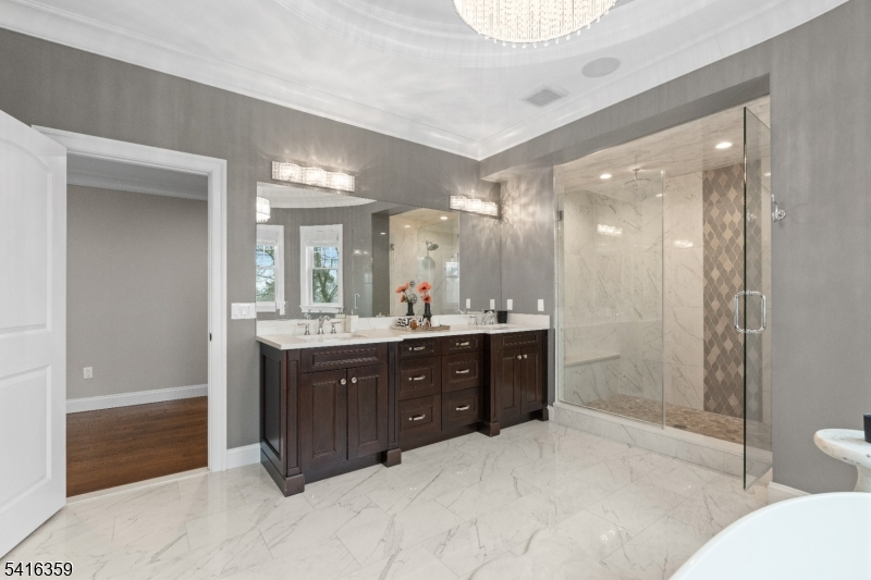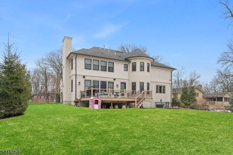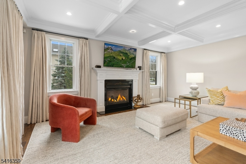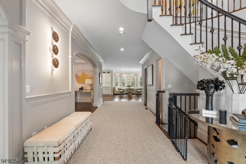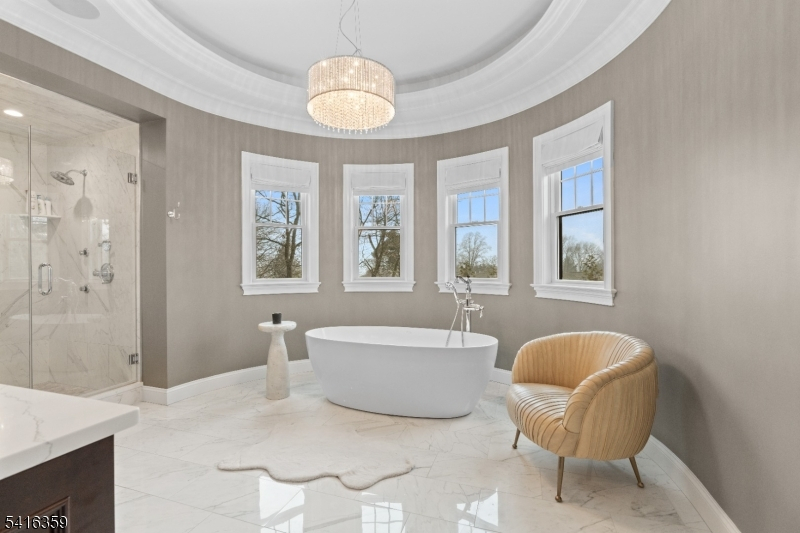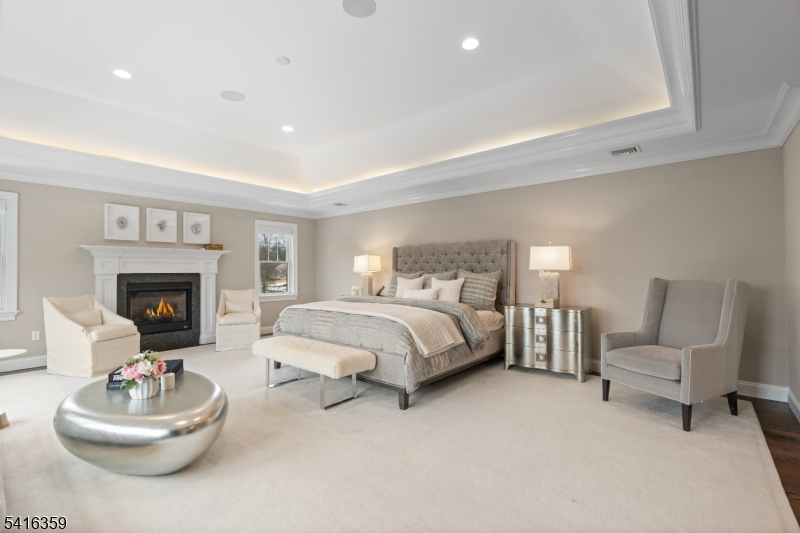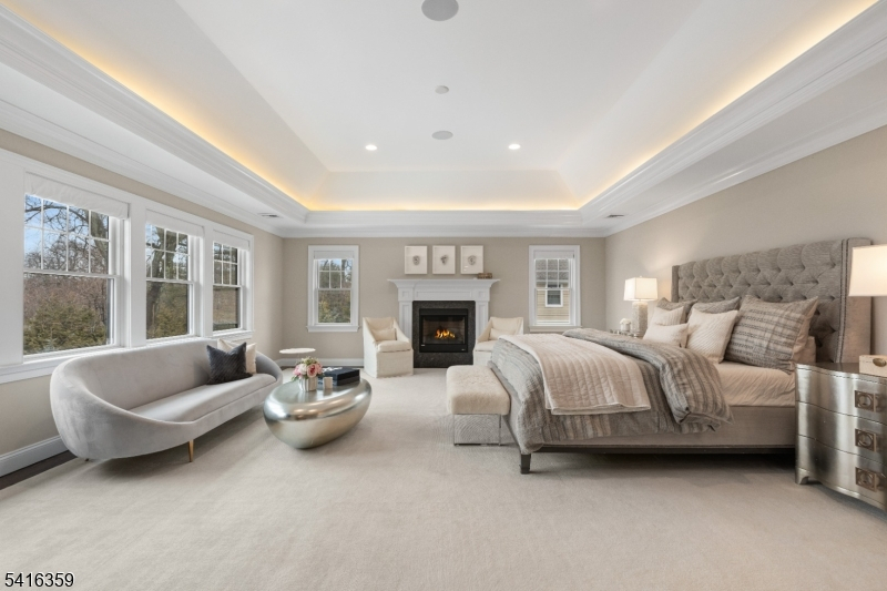 Step into a world of refined living where stunning architectural detail meets iconic style. Upon entering, a dramatic sweeping staircase and striking chandelier set the tone for the home's distinctive design. The main level offers spacious living and entertaining areas, including a family room with a fireplace, coffered ceilings, and a custom built-in wet bar with wine fridge. Extensive custom millwork further enhances the sophisticated character throughout. The chef's kitchen features custom cabinetry, quartz countertops, marble backsplash, high-end appliances, and a large center island. Enjoy meals in the sunlit breakfast area framed by windows overlooking the backyard. Upstairs, the primary suite offers a private retreat with tray ceiling, cove lighting, fireplace, spa-like bath with freestanding soaking tub, and an expansive custom walk-in closet. Additional highlights include four generously sized bedrooms with well-appointed bathrooms and a conveniently located second-floor laundry. The finished walk-out lower level expands the living space with a dedicated movie theater complete with surround sound, along with a recreation area ideal for a gym, billiards room, or play space with walk-out access to the backyard. Additional features include a convenient mudroom off the three-car garage, multi-zone heating and cooling, and a spacious backyard offering endless potential for outdoor living and entertaining.